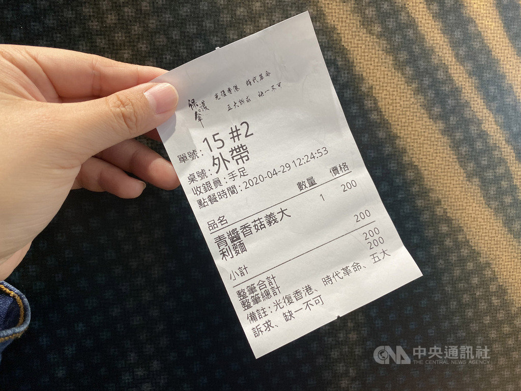 位於台北的「保護傘」餐廳,店內裝潢充滿「反送中」元素,取餐單的備註也印上「光復香港、時代革命、五大訴求、缺一不可」標語;收銀員則統稱「手足」。中央社記者賴言曦攝 109年4月29日