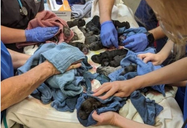 根據7news報導,狗狗的名字叫「影子」(Shadow),動物醫院表示,「影子到達醫院後接受檢查,發現肚子裡面至少還有10隻幼犬」,迅速的檢查幼犬的心跳之後,便立刻進行緊急剖腹手術。過程中影子流出大量的血液,血壓也跟著下降,因此需要進行切除卵巢子宮挽救生命。