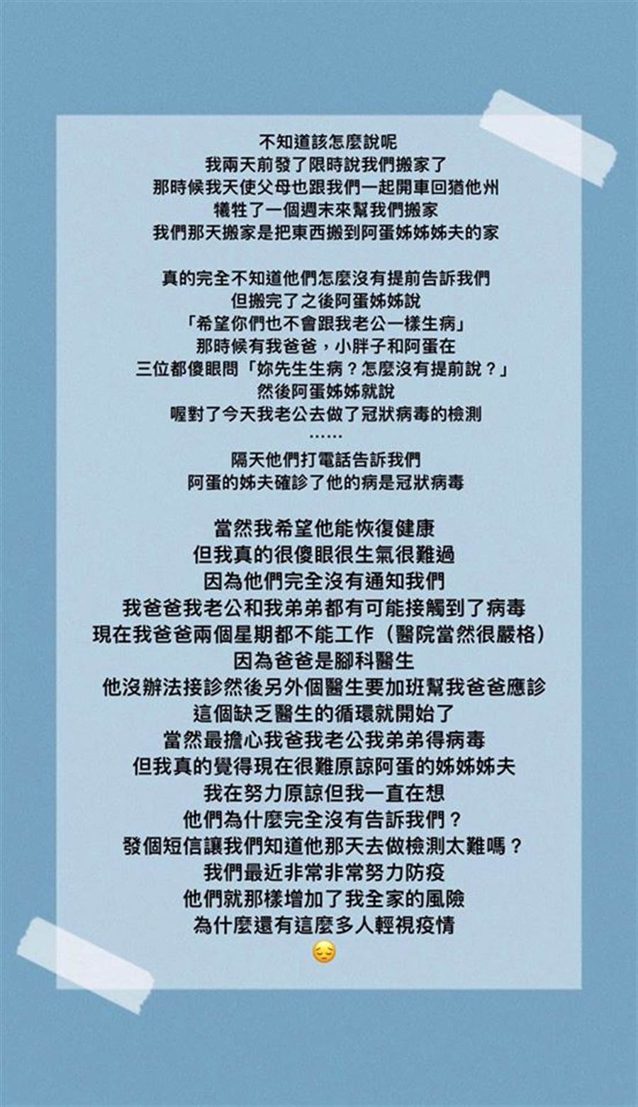 曾在台灣傳教學中文的莫彩曦近日拍了影片直擊美國當地疫情現況,今日她卻突然發文,「請大家幫我們和全世界祈禱」。莫彩曦透露,日前父母犧牲一個周末來幫她和Adam將物品搬到Adam姊姊、姊夫家,不料,搬完後Adam姊卻說,「希望你們也不會和我老公一樣生病」,這讓在場所有人傻眼問,「妳先生生病?怎麼沒有提前說?」接著對方才說,「喔對了今天我老公去做了冠狀病毒檢測…」,隔天Adam姊夫也確診感染新冠肺炎。