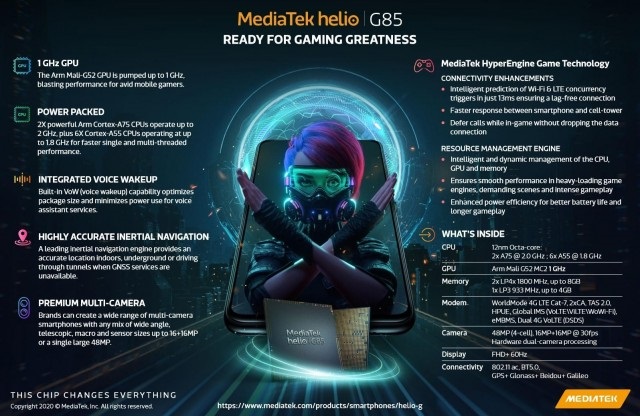 而在圖形處理能力方面,Helio G85 行動處理器整合了時脈 1GHz 的 ARM Mali-G52 GPU 和新的 HyperEngine 引擎。攝影功能則是可支援 4,800 萬像數的攝影鏡頭,影片錄製也可支援到 240fps。另外,聯發科還表示,Helio G85 行動處理器可以智慧預測 Wi-Fi 和 LTE 的併發性,處理器可以在 13 毫秒內在進行網路間的切換,以提供無延遲的連接。