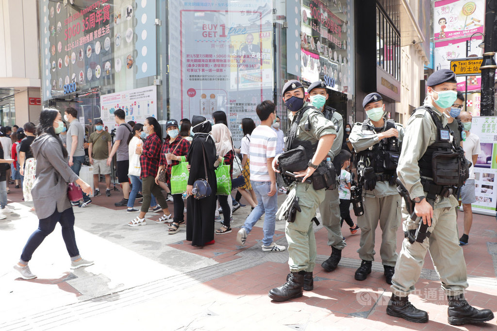 香港「反送中」運動支持者早前在網上發起「天馬行動」,趁「五一」勞動節進行快閃示威和堵路等,警方對此高度戒備。圖為防暴警察駐守銅邏灣。中央社記者張謙香港攝 109年5月1日