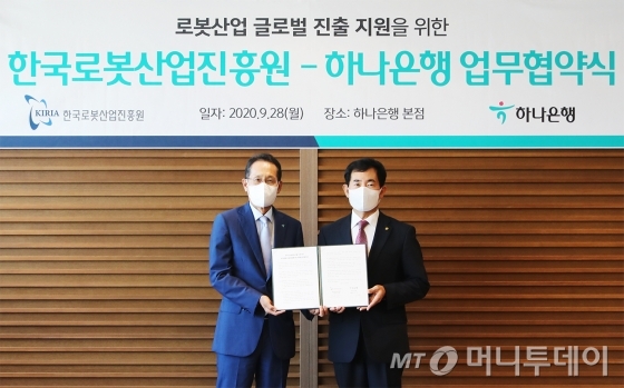 | 지성규 하나은행장(왼쪽)과 문전일 한국로봇산업진흥원장이 28일 오전 서울시 중구 을지로 하나은행 본점에서 업무협약을 체결한 뒤 기념촬영을 하고 있다./사진제공=하나은행 |
