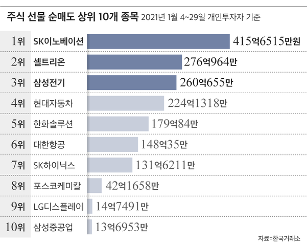 지난달 개인투자자들이 셀트리온(068270)주식 선물을 300억원 가까이 순매도한 것으로 나타났다. 이는 유가증권 시장 151개 주식 선물 종목 중 SK이노베이션(096770)에 이어 가장 많은 규모다.