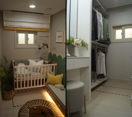 한시도 눈을 뗄 수 없는 영아 단계, 그리고 부모와 같은 침대를 쓰는 유아 때까지는 아이방으로 활용하다가, 아이가 독립적인 성향을 갖게 되면 따로 방을 내주고 옷장으로 활용할 수 있다는 설명이 이어졌다.