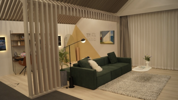 1층으로 내려가자 보다 색다른 신혼주택이 시선을 사로잡았다. LH가 기획전시 공간으로 설치한 세 가지 스타일룸 중 하나인 ‘레이어드 홈’이었다. 전용면적 46㎡라는데, TV와 소파, 책상에 요가매트까지 놓고도 널찍한 공간이었다. 특히 중앙에 자리한 녹색 모듈형 소파를 어떻게 배치하느냐에 따라 공간 전체가 홈트레이닝 공간이 되기도 하고, 홈카페, 홈오피스가 되기도 했다.
