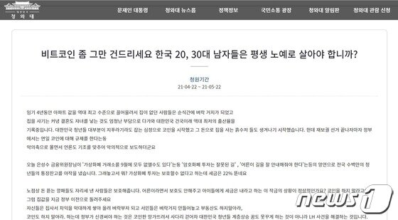 20·30대로 추정되는 청원인은 "대한민국 청년들 대부분이 지푸라기라도 잡는 심정으로 코인을 시작했고 그 돈으로 집을 사는 흙수저들도 생겨나기 시작했다"며 "헌데 재보궐 선거 끝나자마자 정부에서는 연일 코인에 대해 규제를 한다는 둥 악의 축으로 몰면서 언론도 기조를 맞추어 악의적으로 보도하더라"라고 주장했다.
