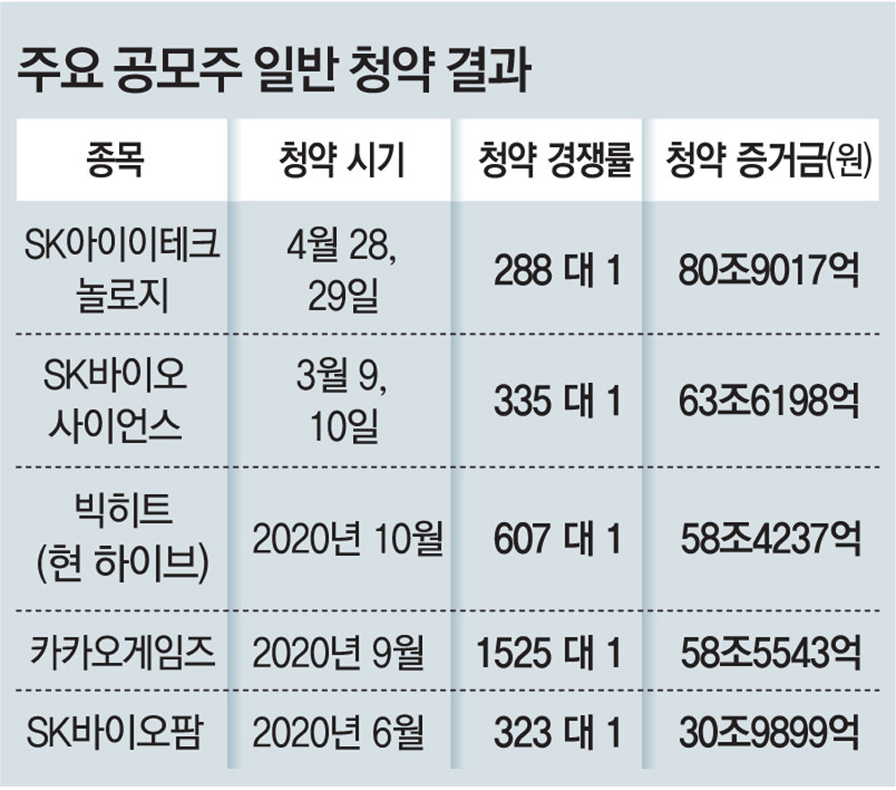 증거금 1억에 2~5주 예상 2차 전지 분리막 제조회사 SK아이이테크놀로지(SKIET)가 사상 최대인 81조 원의 청약 증거금을 끌어모으며 한국 공모주 시장의 역사를 다시 썼다. 시중에 풀린 막대한 유동성이 공모주 시장으로 몰린 가운데 여러 증권사에서 중복 청약이 가능한 마지막 대형 공모주로 주목받으면서 역대 가장 많은 317만 개 계좌가 참여했다.