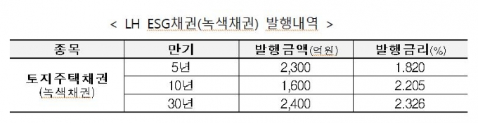 이번에 발행한 녹색채권 6300억원은 LH가 국내채권으로 발행한 최초의 ESG채권이다. 환경부의 '녹색채권 가이드라인'에 따라 발행자금은 환경 개선을 목적으로 하는 녹색 프로젝트에 사용 가능하고 △조달 자금의 사용 △프로젝트 평가와 선정 과정 △조달 자금의 관리 △사후보고 의무사항 등을 충족해야 한다.