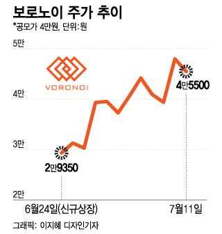 11일 증시에서 보로노이 (45,500원 ▼2,500 -5.21%)는 전일 대비 2500원(5.21%) 하락한 4만5500원에 장을 마쳤다. 하락 마감했지만 장 중 5만2600원까지 오르며 역대 최고가를 경신했다. 상장 첫 날인 지난 6월 24일 장 중 공모가보다 27.3% 낮은 2만9100원까지 떨어졌지만 비교적 단기간에 공모가를 회복했다. 이제 공모주 투자자는 수익 구간이다.