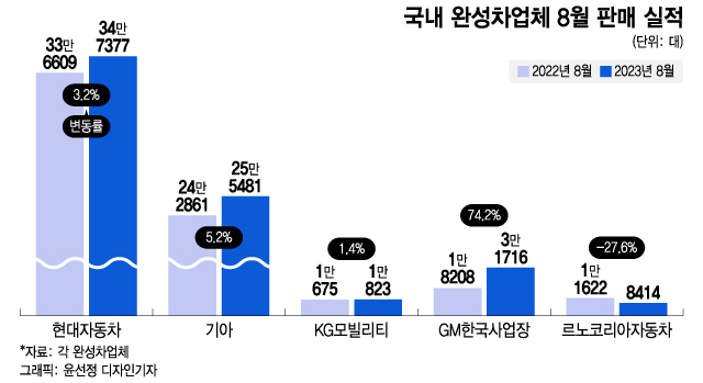 1일 완성차 업계에 따르면 국내 5개사(현대차·기아·한국GM·KG모빌리티·르노코리아)의 8월 글로벌 판매량은 65만3811대를 기록했다. 이는 지난해 8월 61만9945대보다 5.5% 증가한 수준이다.